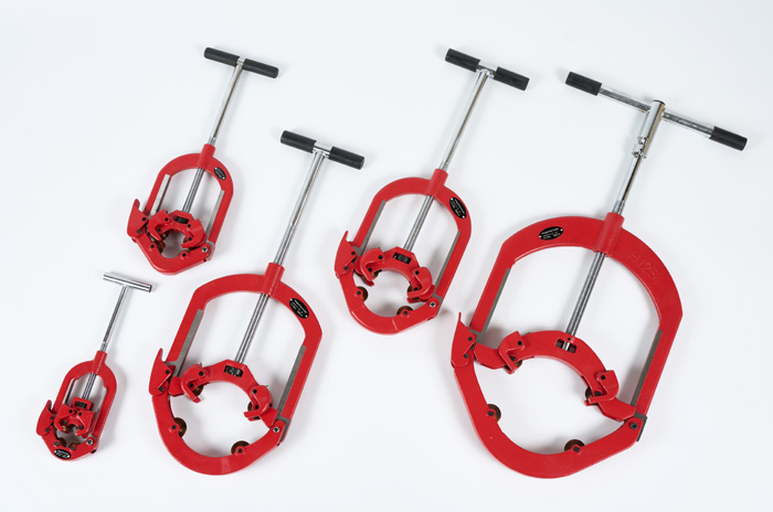 Труборезы с хомутной защелкой отличаются более прочной конструкцией, используются в основном для резки стальных труб даже больших размеров - до 300 мм (12"). Основное их преимущество, как можно заключить из названия - хомутная защелка, позволяющая закреплять труборез в любом месте уже проложенной трубы. Прижим роликов осуществляется с помощью винтовой рукоятки, как и в С-образных труборезах.